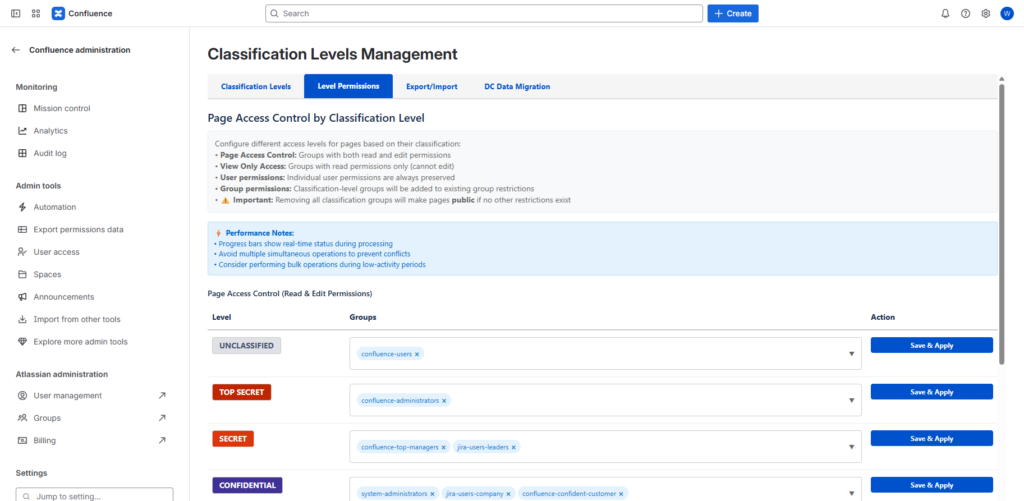 How it works: When you assign groups to a classification level, the app automatically applies Confluence page restrictions to all pages with that classification.