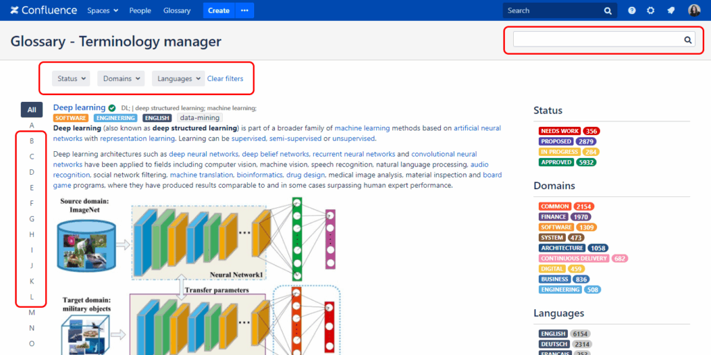 Search, filter and view terms list View all terms at glance To access all terms hit “Glossary” in Confluence header. See screenshot below: View terms in a space Doc navigation← Manage term pageHighlight terms →